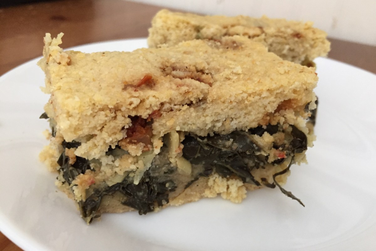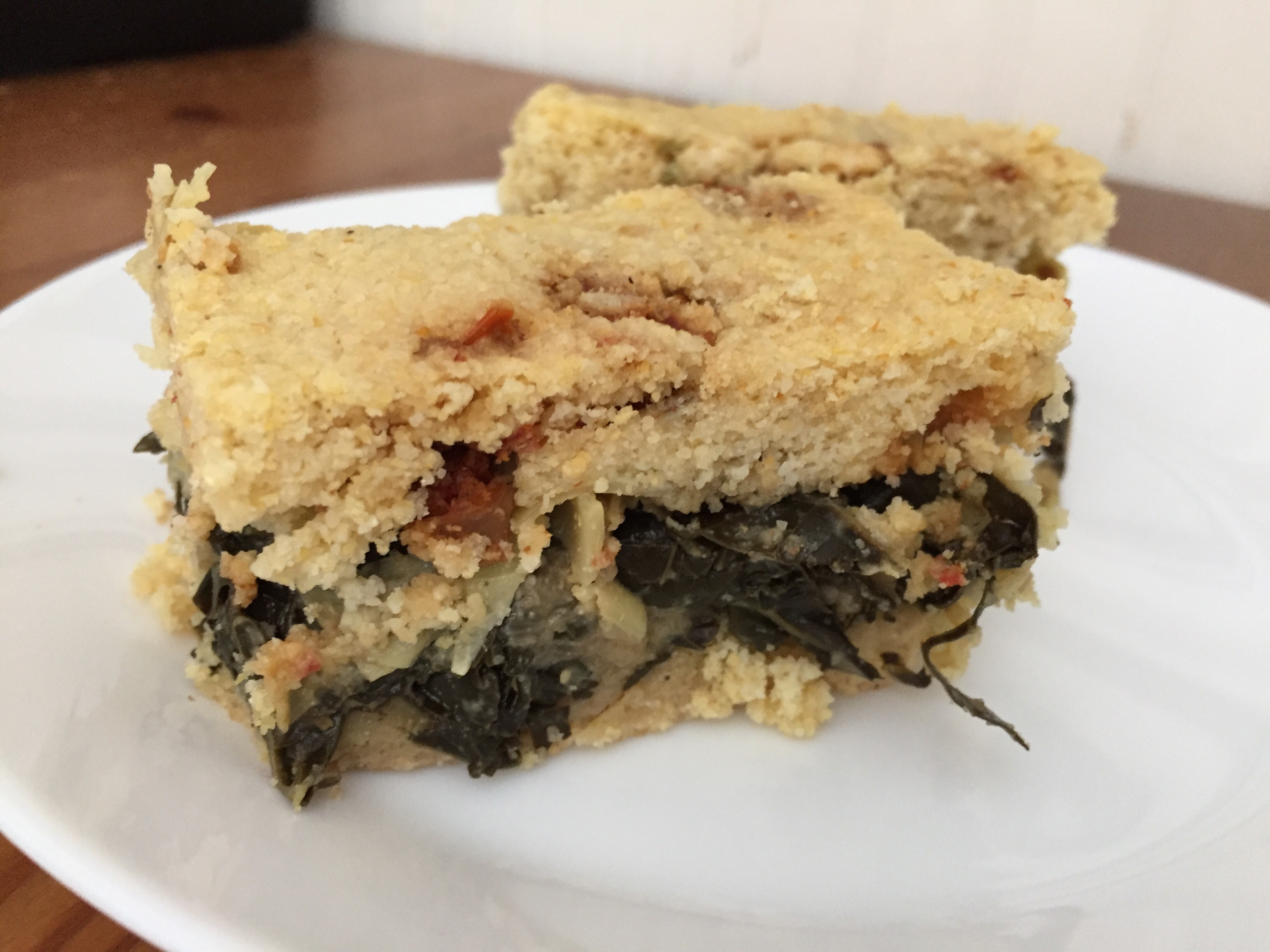 8. Grease the bottom and sides of a 9 x 13 in (23 x 33 cm) baking dish with some oil. Pour in half of your batter and spread evenly. Top with sautéd kale that you drained from access liquid, then top with sliced artichoke hearts, then with sliced sun dried tomatoes. Finally, pour over the rest of the batter, smooth the top and place in the oven for 30 minutes.