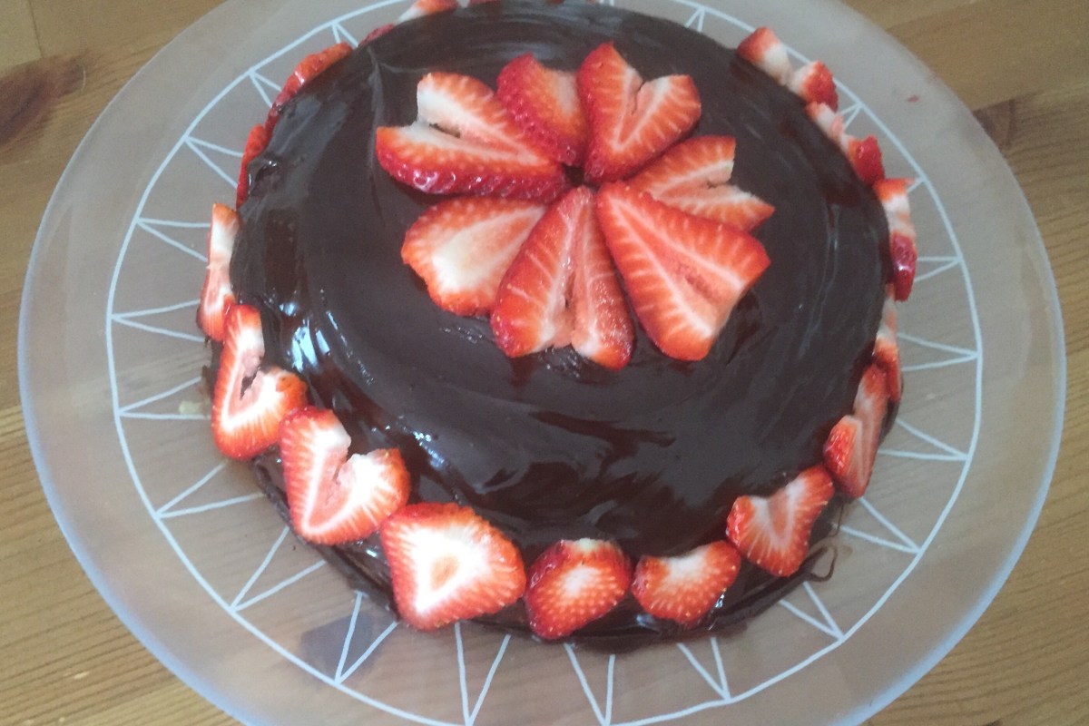 Pour the melted chocolate ganache over the top and spread as evenly as possible over the top and around the sides. Decorate with fresh strawberries, set aside for 2-3 hours then dive in!
