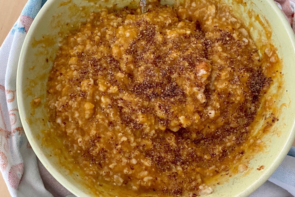 Place the mashed sweet potatoe into a large mixing bowl, and add all the rest of the ingredients. Mix well, and use the immersion (stick) blender to get the consistency nice and smooth, and the oats broken up. If you don’t have the stick blender you can always use your food processor. Let the mix stand for 20 minutes or so to allow the oats to begin soaking up the excess moisture and swell.