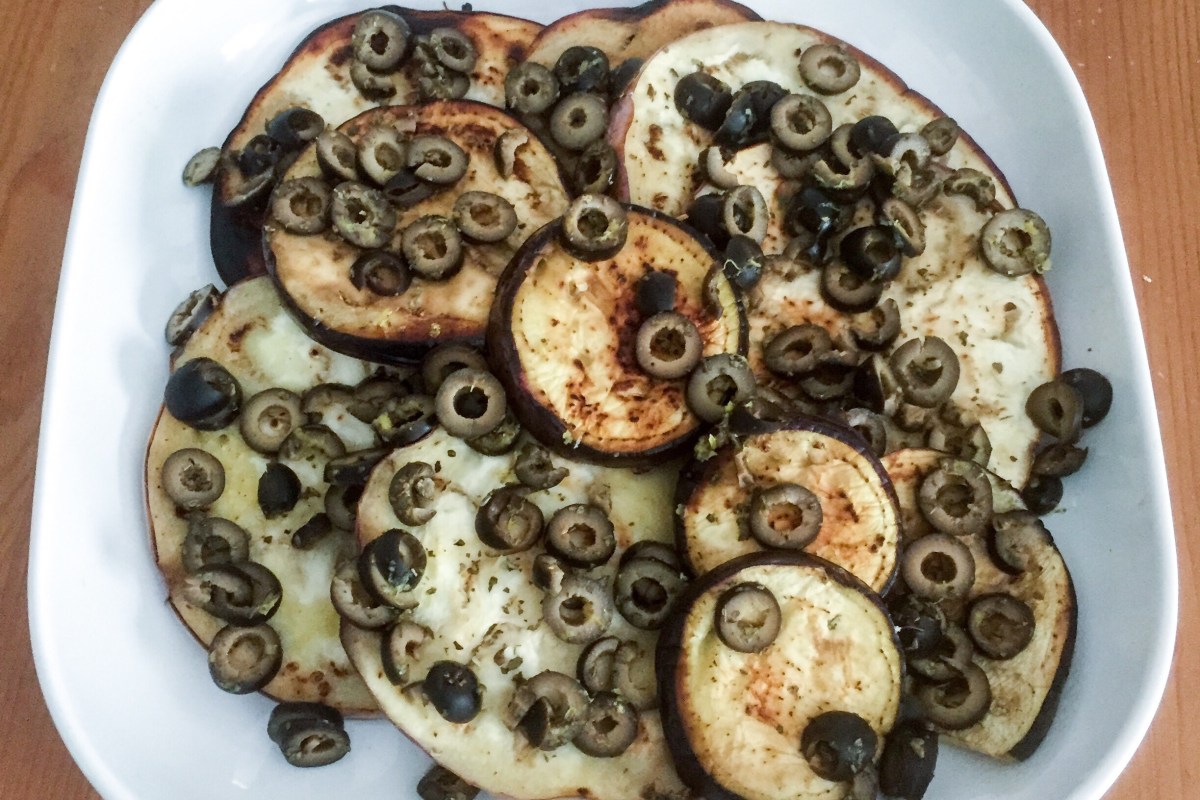 - Use the garlic clove and rub the eggplant slices, so that they are infused with garlic aroma. Place the garlic rubbed eggplant into a large mixing bowl, add lemon juice, lemon zest, and sliced black olives. Mix well and you are done! If you like to add a bit more flavors to this simple side dish, you can drizzle some olive oil, sprinkle fresh parsley, or add a dash of crushed red pepper flakes if you are open to turning on the heat!