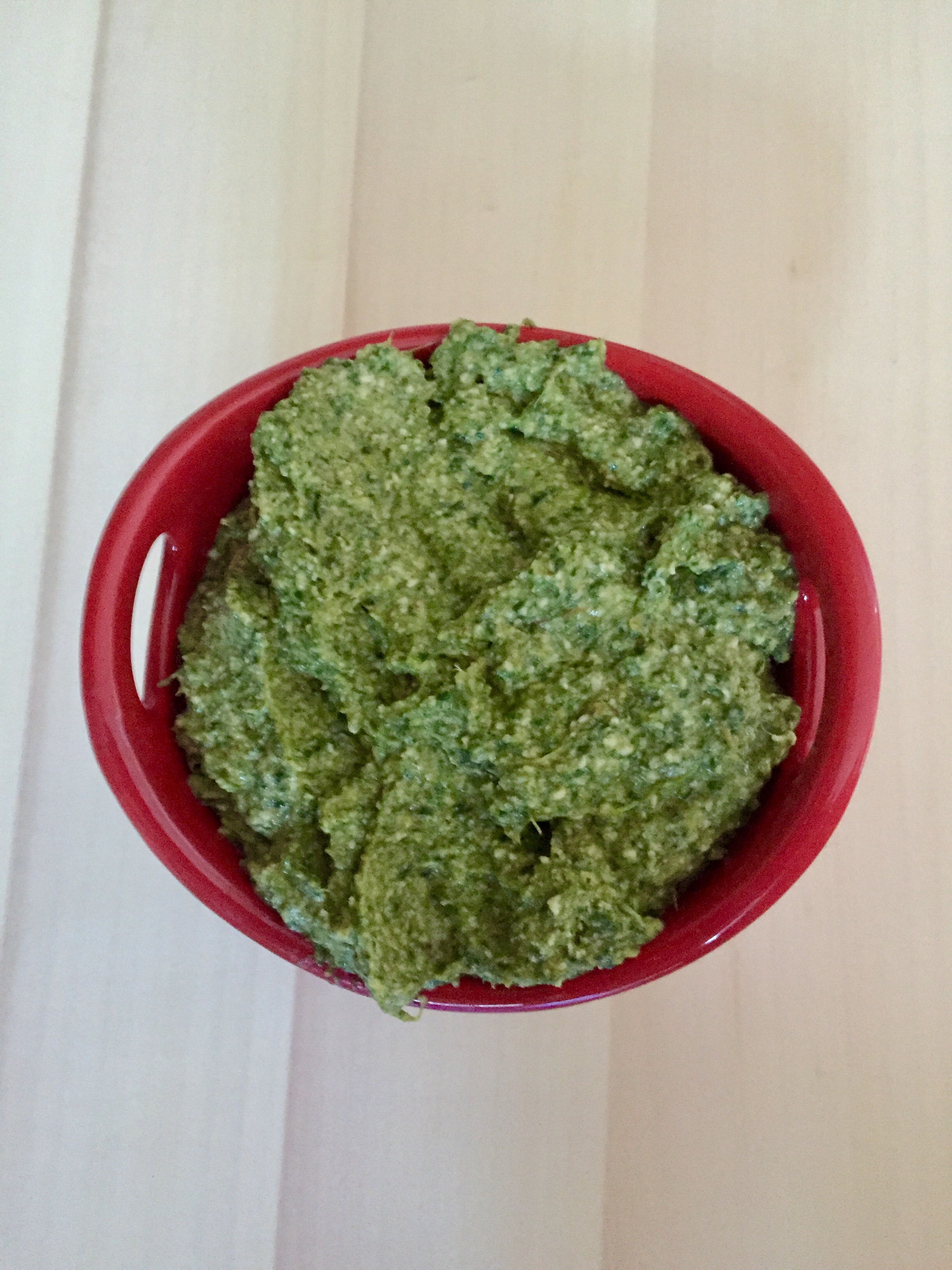 I prescribe to a very broad definition of what pesto is. To me it usually means a sauce (spread, dressing) made with some green leafy vegetables and/or herbs and nuts – and that’s it! Any combination that gets you there counts as a sort of pesto in my book. You can think of combining green things like basil, spinach, arugula, parsley, mint, kale, on one hand, with pine nuts, almonds, pistachios or seeds of different kind (like pumpkin, sesame or sunflower) on the other hand, and you will end up with a flavorful “pesto”. My examples here include Pumpkin Seed and Parsley Pesto and Kale Pesto with Cashews.