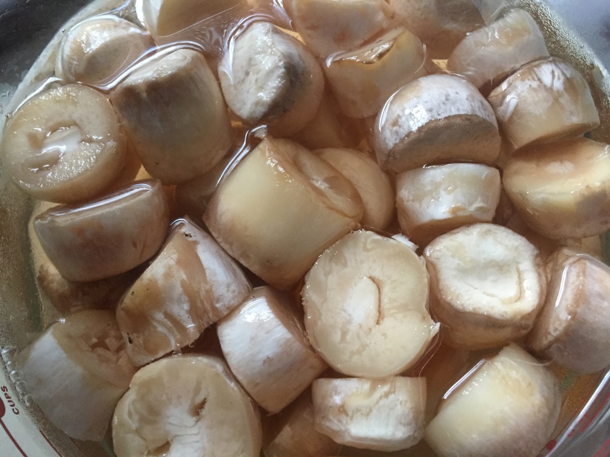 Cut large white button mushroom stems into 1 in (2.5 cm) pieces. Soak in water overnight, or in hot water for 1-2 hours.