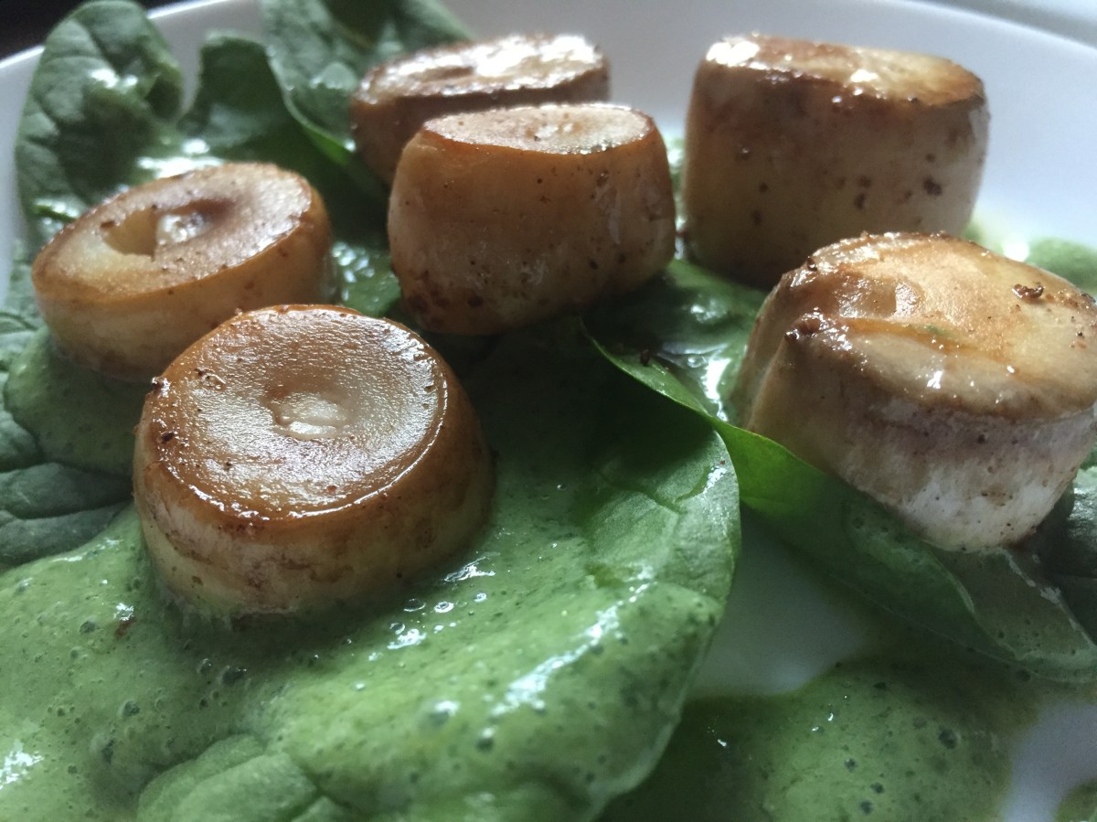 You can serve these mushroom “scallops”, and the sauce, with pasta or polenta, but I plated them as an appetizer over some fresh baby spinach leaves. The “scallops” were hot when plated, and their heat wilted the spinach a bit as well. I let them sit for few minutes before layering on cold yogurt sauce and serving immediately!!!