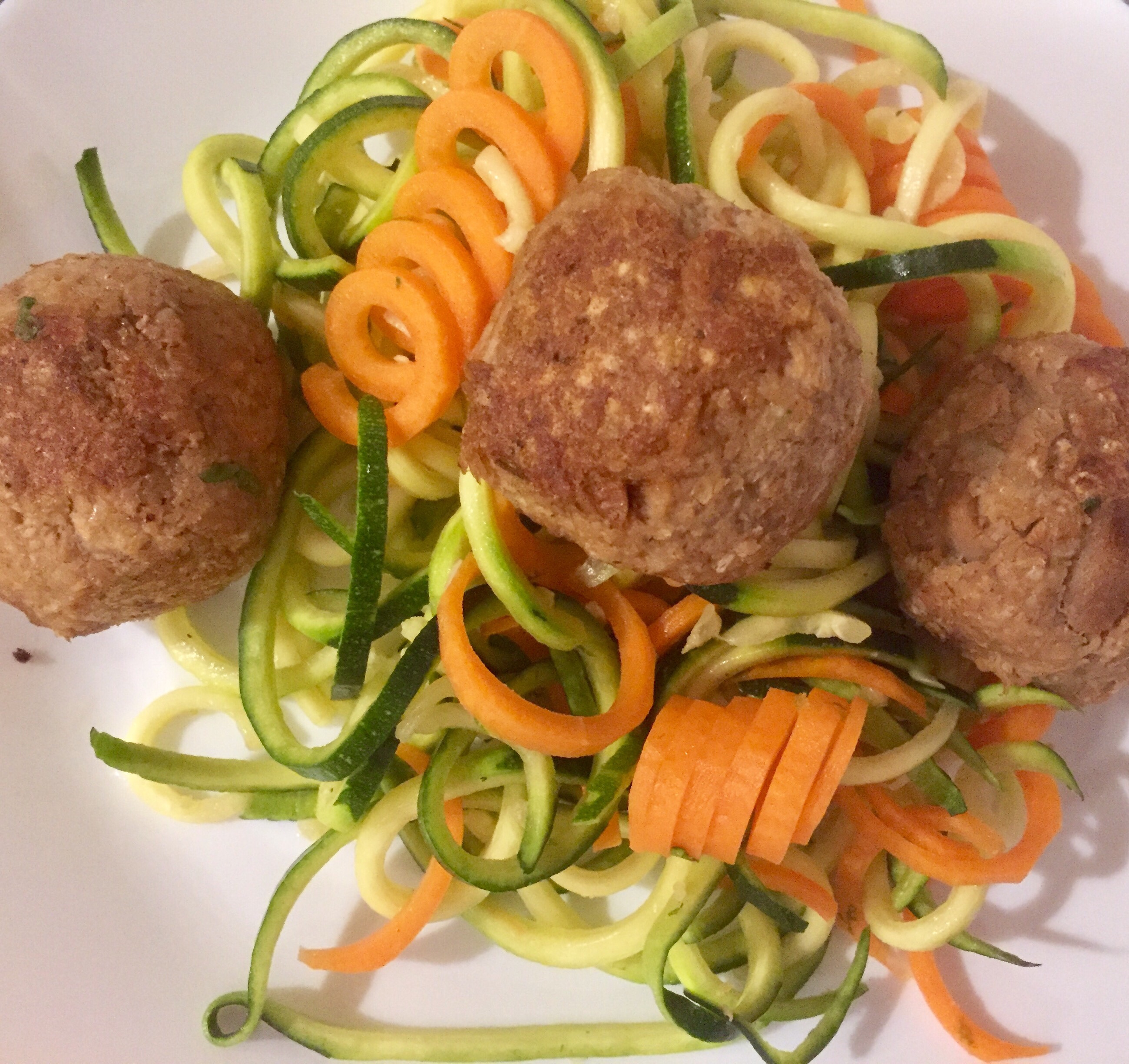 To keep the recipe ultra healthy and gluten-free, I paired the meatballs with simple Zucchini Spaghetti.